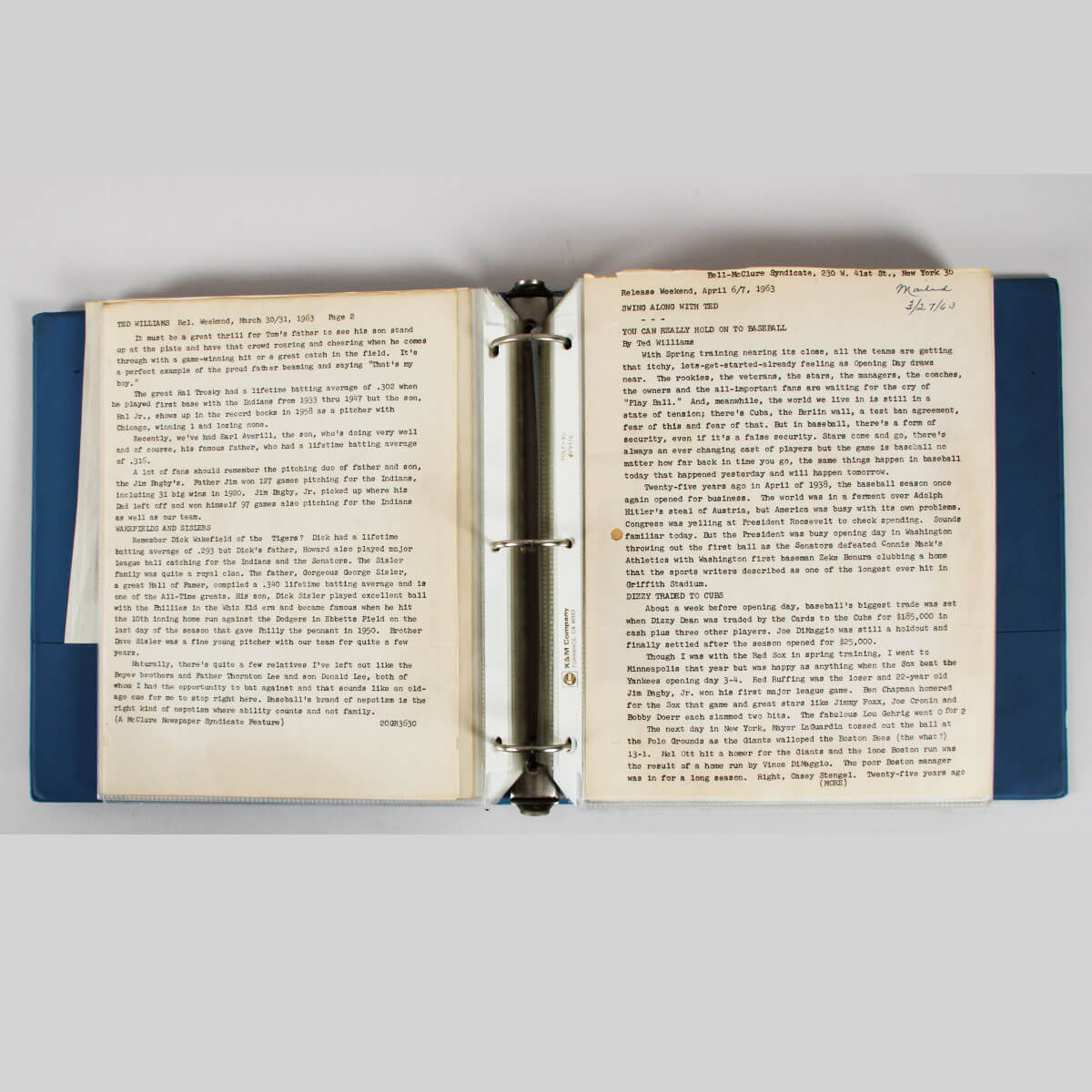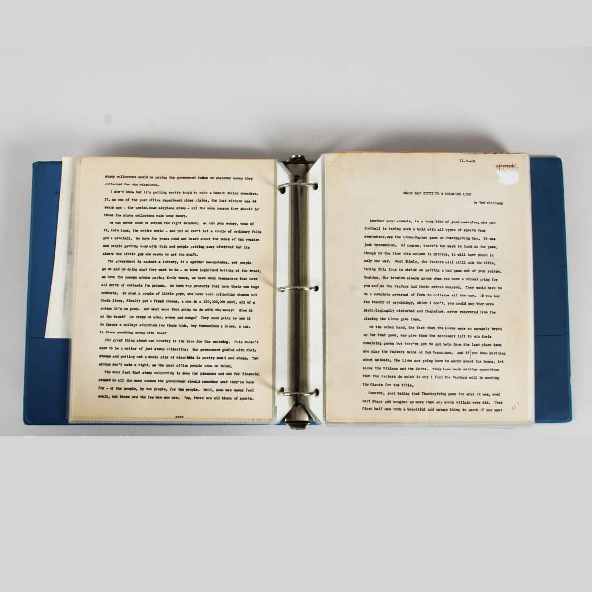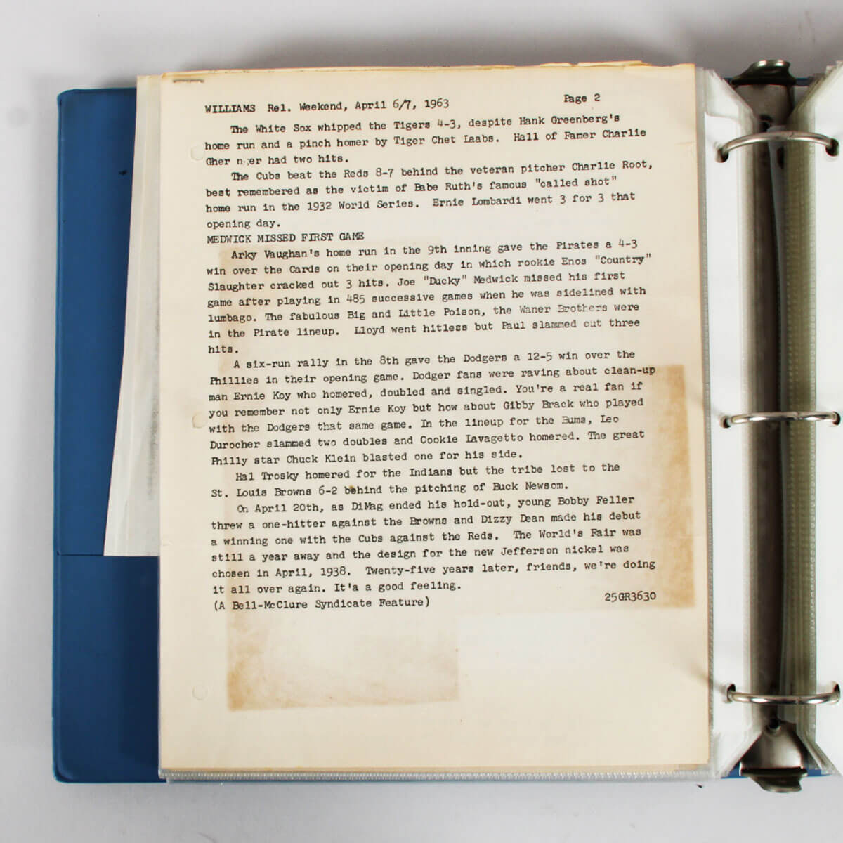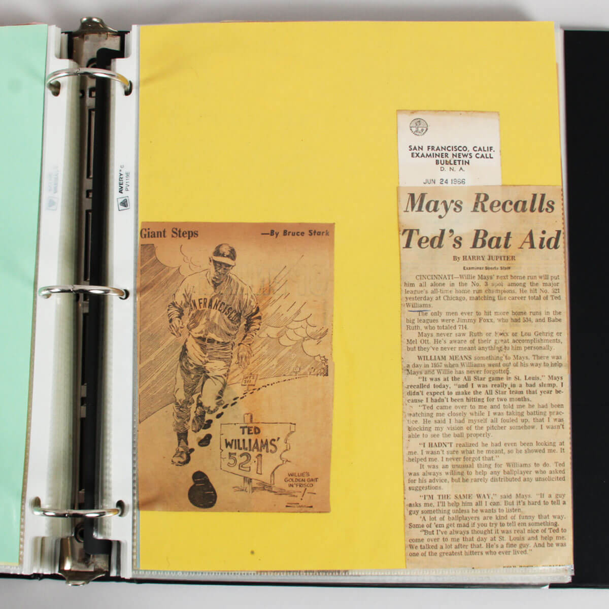 Offered for sale is a Ted Williams Personal Sports Collection from the 1960s. There are two full notebooks with clippings from Ted’s playing games and newspaper clippings.