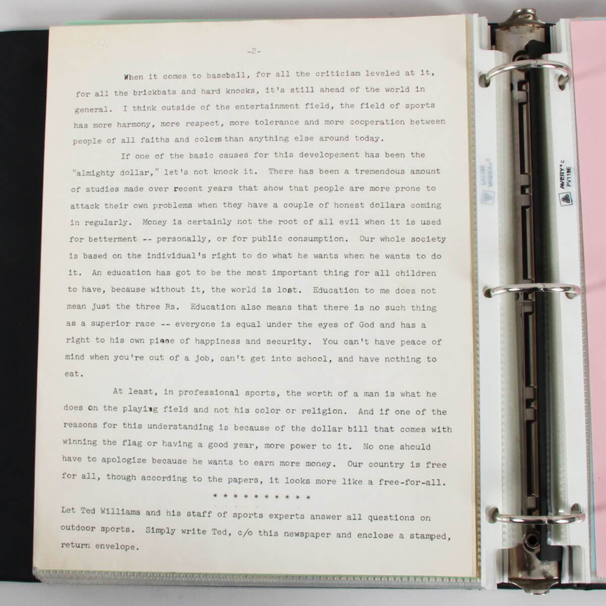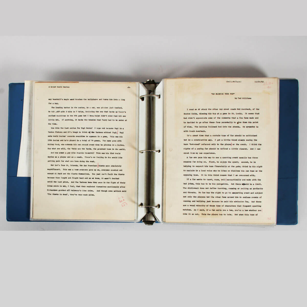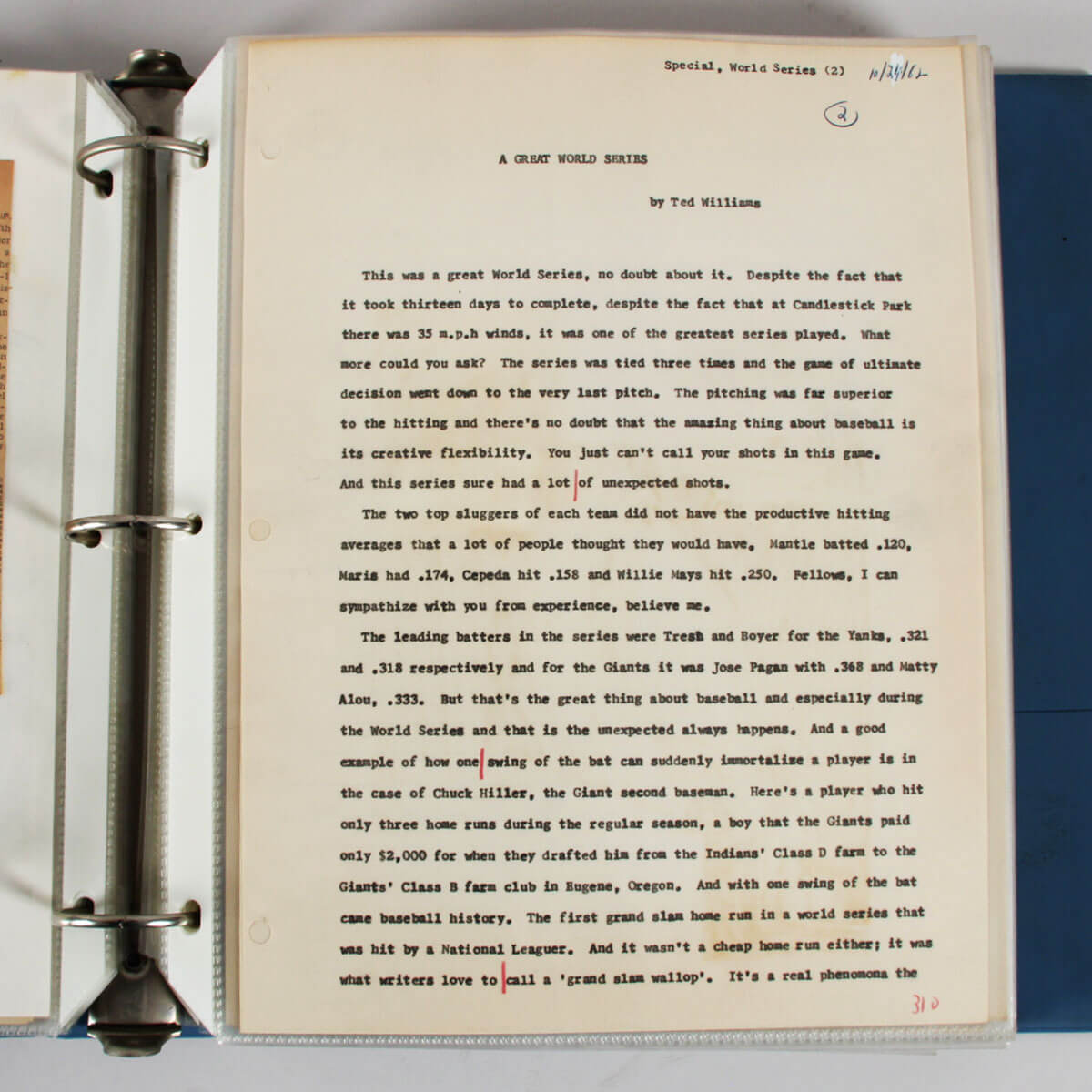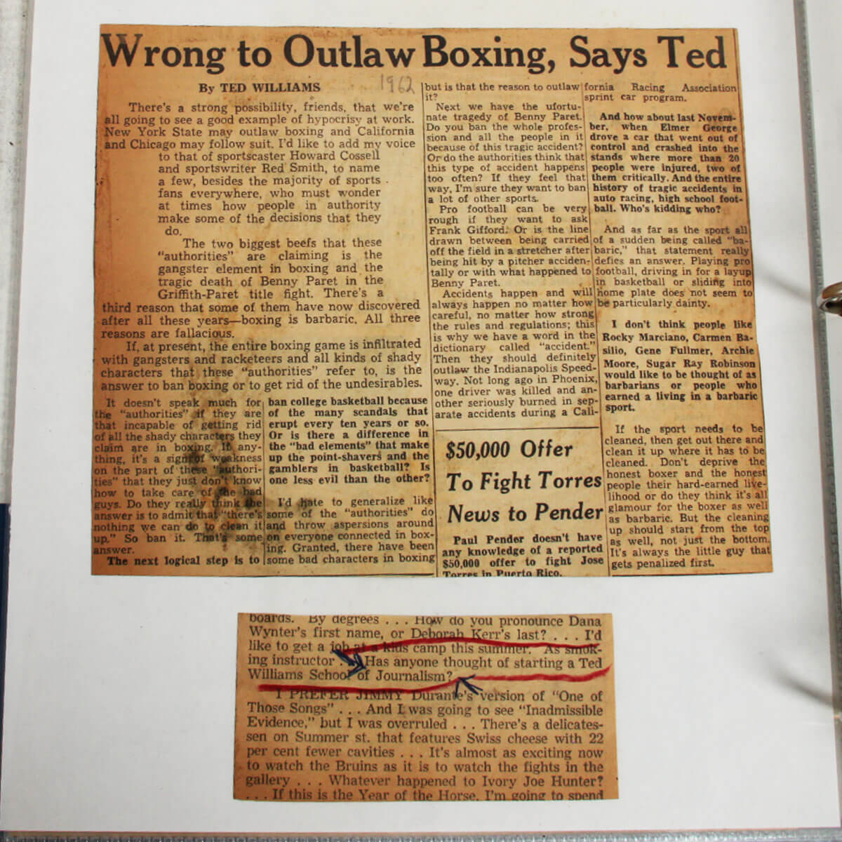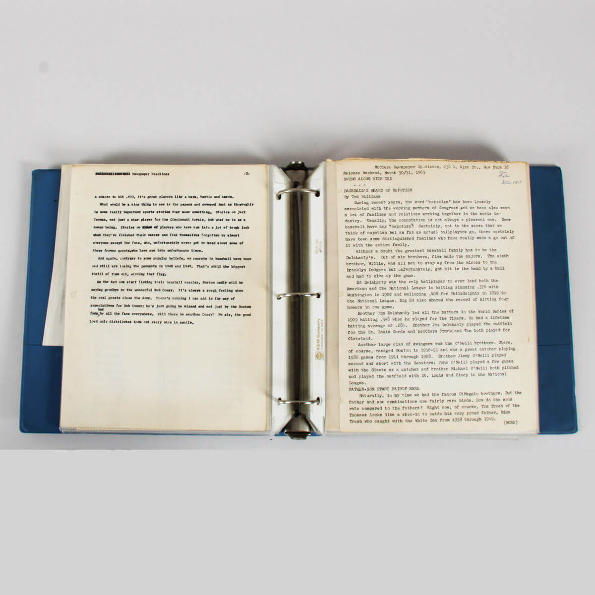 Offered for sale is a Ted Williams Personal Sports Collection from the 1960s. There are two full notebooks with clippings from Ted’s playing games and newspaper clippings.