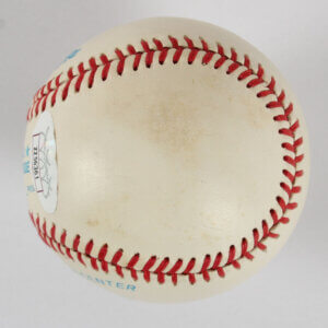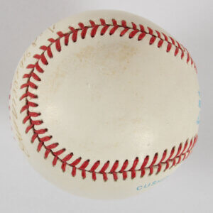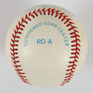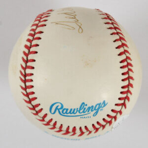 Presented is a Ted Williams signed OAL (Brown) baseball. The signature is on the “sweet spot” in blue ballpoint pen and grades a “9”. The orb itself shows toning throughout.
