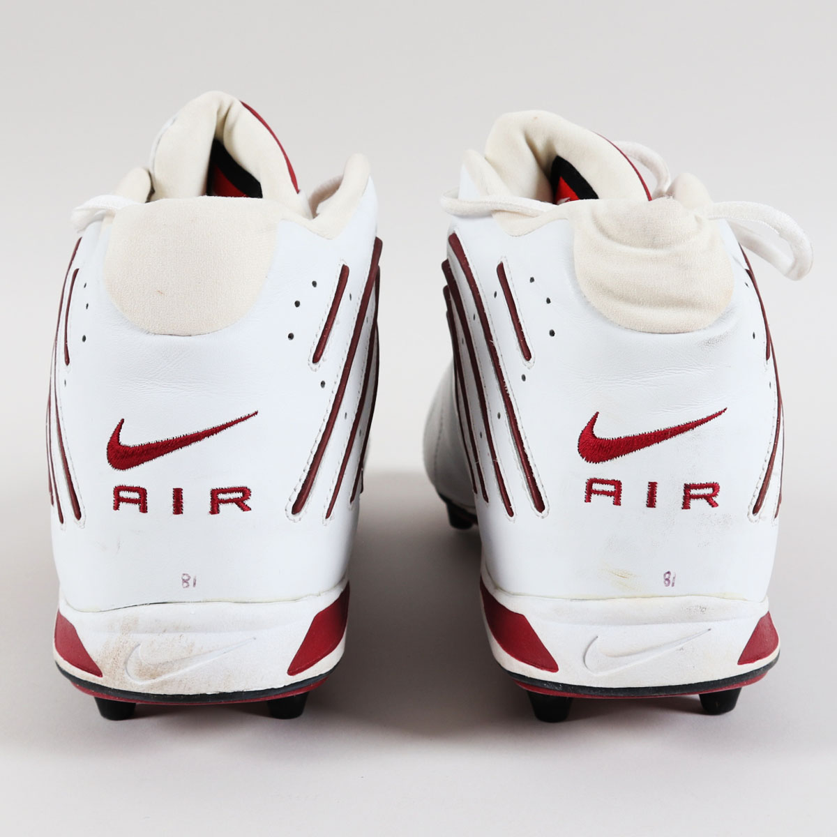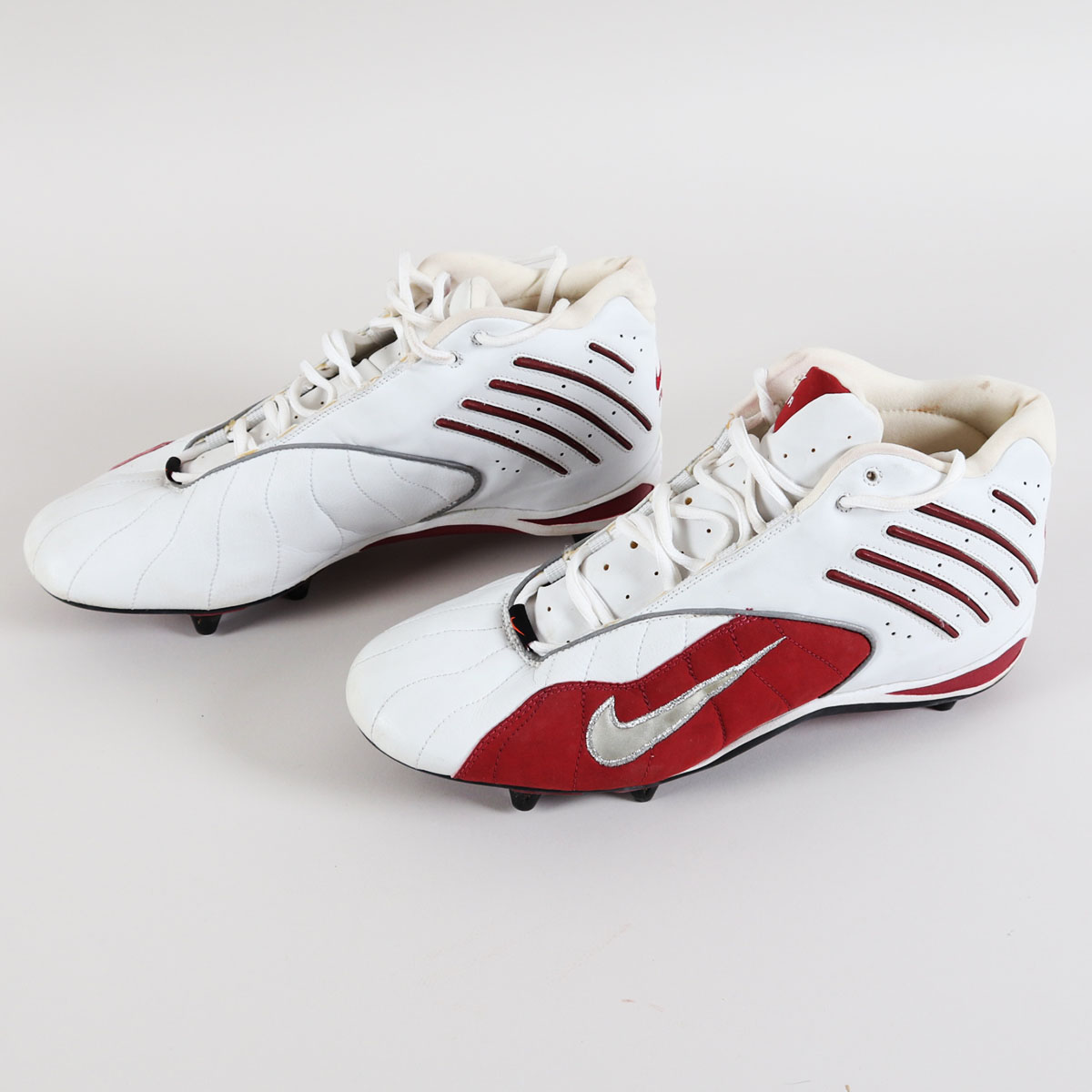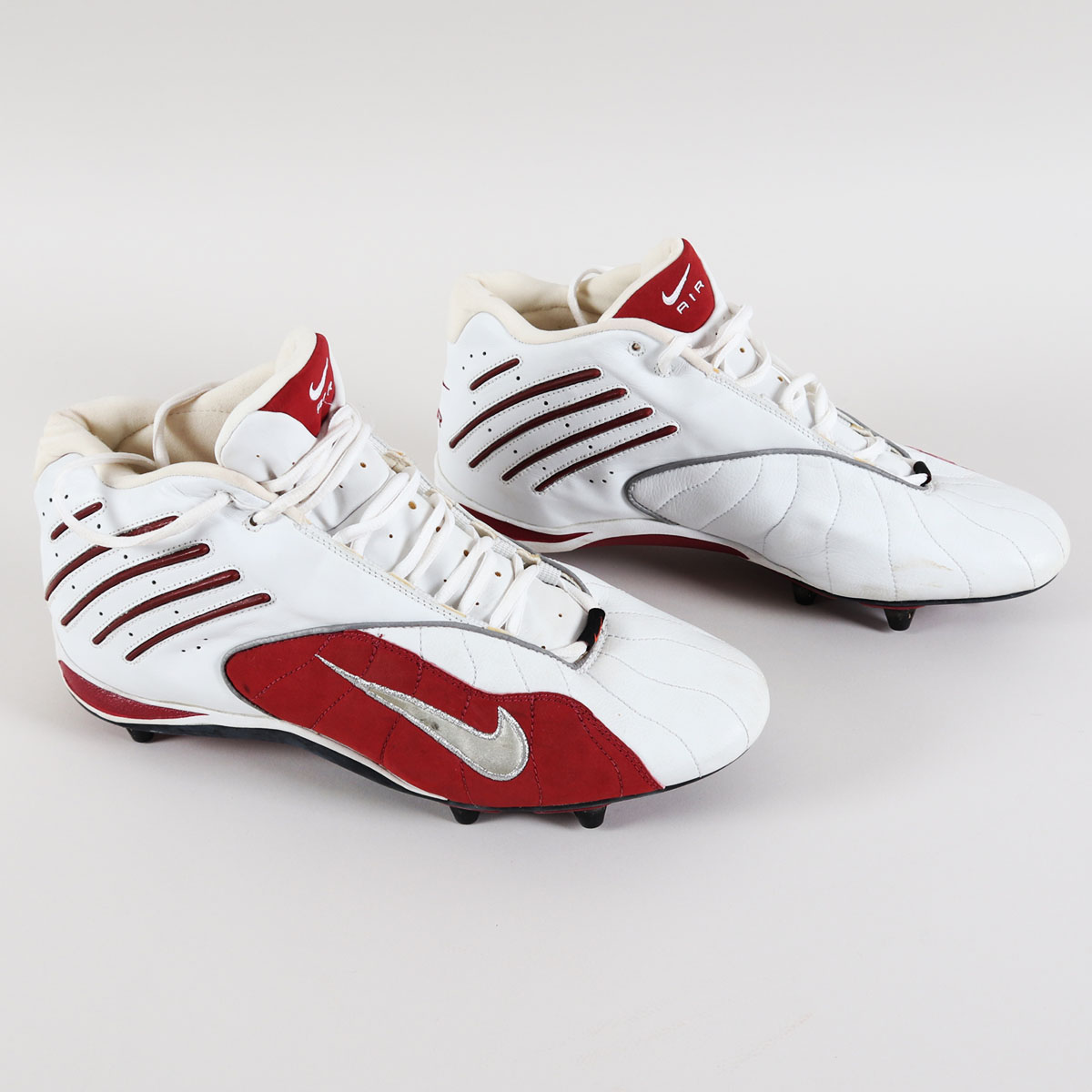 Presented is a pair of Terrell Owens game-worn cleats from his time with the San Francisco 49ers. Nike cleats sport a red, white and black swoosh colorway. Interior tagging reports a size “14” and correct coding. Fine game wear is evident with scuffs, field dirt, and transfer marks.