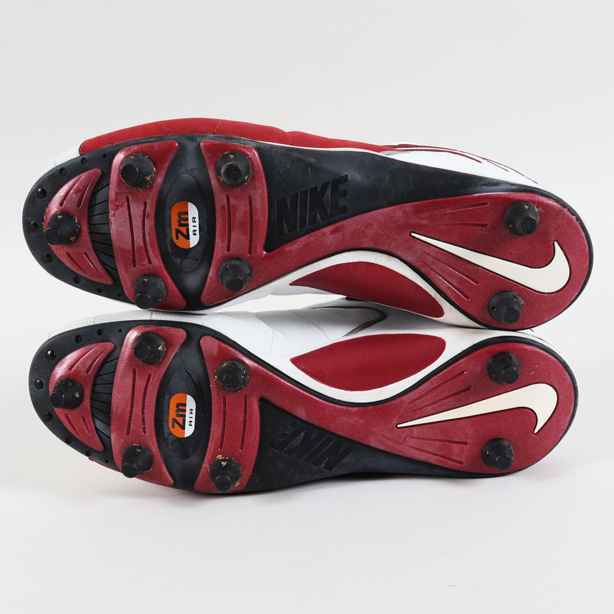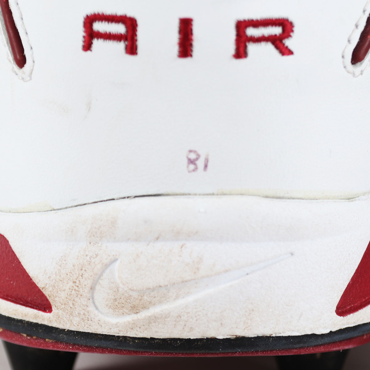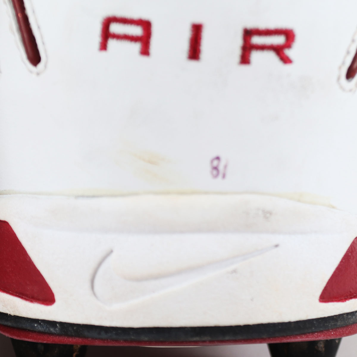 Presented is a pair of Terrell Owens game-worn cleats from his time with the San Francisco 49ers. Nike cleats sport a red, white and black swoosh colorway. Interior tagging reports a size “14” and correct coding. Fine game wear is evident with scuffs, field dirt, and transfer marks.