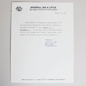 Additional paperwork is a player letter from former Boston Red Sox star Marty Barrett who played in the major leagues from 1982 to 1991. Marty played with the San Diego Padres in his last season in 1991.