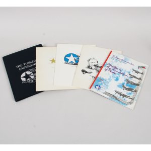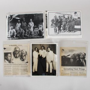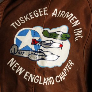 This custom jacket is a vintage Tuskegee Airmen Bomber jacket. It was likely produced as a commemorative item around the date displayed on the back (1988). The specific text “USAFA May 6, 1988 refers to an event at the United States Air Force Academy (usafa) on May 6, 1988, where the Tuskegee Airmen were honored. The jacket has minimal wear, if any, size Medium. Additionally included in this lot are photos and books (small photos, a fuzzy pamphlet, New Republican 1982 Awards Dinner, 3 programs, Tuskegee experience book, Tuskegee convention programs, clippings, etc.) of Frank “Fuzzy” Hector, a Tuskegee airman from WWII. All of this was to honor him, as the movie was produced at Warner Bros. Studios in 1995. Tuskegee. These were all momentos from the movie.
