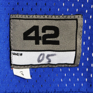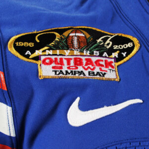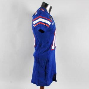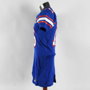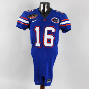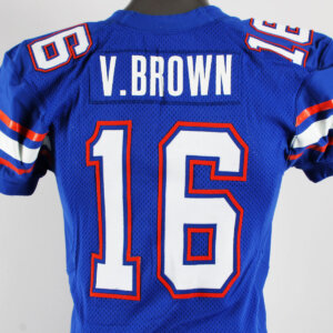 On the front, back, and each shoulder is the player number “42” screened on in white and orange. The Gator patch logo is present on the chest along with the 2006 Outback Bowl, sides are Spandex and the custom elastic sleeves are striped in team colors orange and white. Across the back is his name “V. BROWN” in white on a nameplate. Tail tagging shows it is a Nike [size] 46 with a S flap. The SEC patch is set in the center collar portion. It does not show any wear/use. Overall, a great Gators game issued jersey.