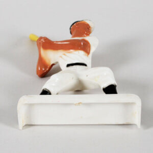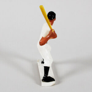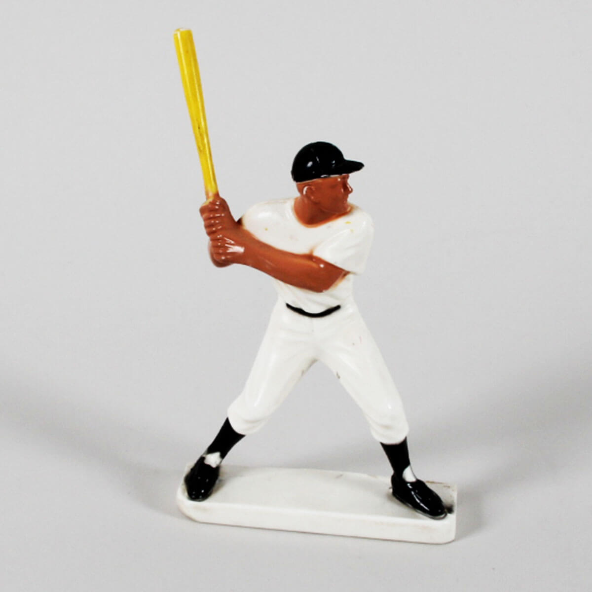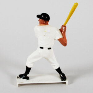This is a Vintage 1950s original Hartland white base minor leaguer, which is very scarce. This statue was created along with the 18 Major League players issued between 1958-63 by the Hartland Company of Wisconsin. Created as a caketopper for a special touch on a child’s birthday cake, it also came with an unusual accessory to display it on the family car’s dashboard. It later became associated with the baseball series because of the #5 on the back; maybe a salute by those at Hartland to honor the “Yankee Clipper”, Joe DiMaggio.