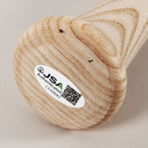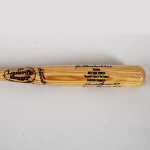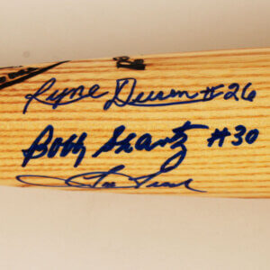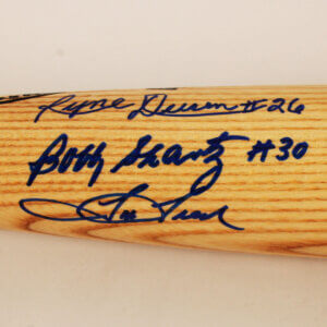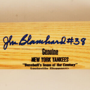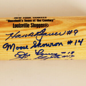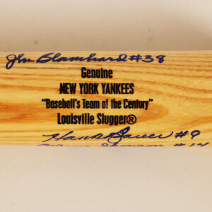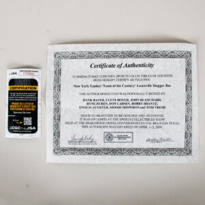 This remarkable memorabilia piece features a specially engraved Louisville Slugger bat commemorating the New York Yankees’ designation as the Team of the Century. Each player’s autograph, rendered in blue felt tip, enhances the bat’s historical significance, showcasing the signatures of legends such as Hank Bauer, Clete Boyer, John Blanchard, Ryne Duren, Don Larsen, Bobby Shantz, Enos Slaughter, Moose Skowron, and Tom Tresh. Accompanied by a Certificate of Authenticity from JSA, this bat represents an invaluable addition to any serious collection of baseball history.